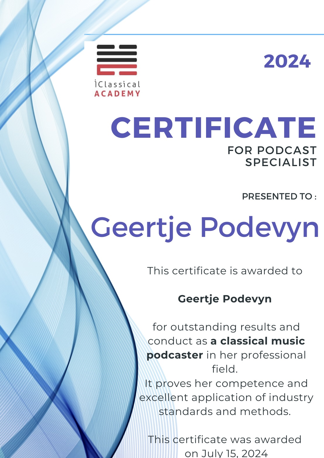 "I'm grateful for my podcast training at iClassical Academy in 2023-2024. The program provided expert speaking, digital skills, marketing, and audio production guidance. I gained the confidence and knowledge to create quality content and grow my audience, thanks to practical lessons and a fair 10-year streaming contract. Thank you!"